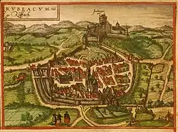 The golden age ended abruptly with the Thirty Years' War, when the town was devastated by the Swedes. Archduke Leopold Wilhelm of Austria held court in the city when he was in Alsace.[8] At the end of the war, when Alsace was conquered by France, the fief was abolished. The city again achieved prosperity, chiefly due to wine growing and the production of kirsch from the cherry orchards connected with the chateau, and because it was spared during the following wars.