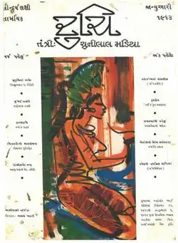 Madia himself wrote a column Chhindu Kholta under the pen name Akho Rupero. He also wrote on social issues in Bahyantar column. He had also written on several prominent personalities and authors in it such as Virchand Gandhi, Krishnaji Holaji Aara, Abdul Rahim, Apabhai Almelkar, Jayant Khatri, Ishwar Petlikar, Umashankar Joshi, Albert Camus, Jean-Paul Sartre, Henry Miller, Behramji Malabari, Octavio Paz, Karl Marx, Shayda, Jhaverchand Meghani, Jyotindra Dave, Dhoomketu, Samuel Johnson, Dag Hammarskjöld, Yevgeny Yevtushenko, Mikhail Sholokhov, Romain Rolland, Boris Pasternak, Leo Tolstoy, Anton Chekhov, Ernest Hemingway, D. H. Lawrence as well as on modern literature. Vadilal Dagli wrote a column Mumbai-ni Diary focused on Mumbai and issues in India. Jayant Pathak published his autobiography Vananchal in serial. Manubhai Pancholi's novel Kurukshetra was started in it but stopped after some episodes. Alan Paton's play, Cry, the Beloved Country was translated by Madia as Bhom Rade Bhenkar which stopped after just three episodes. Several other writers have published criticism, essays and works on authors in it.[1] The cover art and other art in the magazine were drawn by various artists such as Raghav Kaneria, Abhay Khatau, K. K. Hebbar, Krishnaji Holaji Aara, Abdul Rahim, Apabhai Almelkar, Bhanu Shah, Leena Sanghvi, Dinesh Shah, Chhaganlal Jadav, Jyoti Bhatt, Laxman Pai, Shyavaksh Chavda, Sudhir Khastagir, Raju. Indradev Acharya and Bansilal Verma ‘Chakor' published cartoons in it.[1]