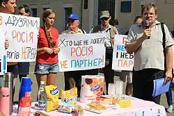 On 14 August 2013, short after the beginning of the embargo, civic movement "Vidsich" called in Social Networks for a boycott of Russian goods to respond the embargo of Ukrainian goods.[30] This message had massively spread in social networks. On 22 August near the Presidential Administration of Ukraine activists held an action during which announced the launch of campaign of boycott of Russian goods. Activists launched a massive campaign on the Internet to attract volunteers and activists to work. From 24 August they massively distributed leaflets calling for a boycott in dozens of cities in Ukraine. Since November activists also begun to distribute leaflets calling for not buying goods in Russian stores and not being served in Russian banks. Activists distributing leaflets often faced resistance and attacks from unknown persons, private security or police officers. Since the beginning of Euromaidan in November 2013 campaign lost its scope. However, activists announced the restoration of campaign in March 2014 after the beginning of the Russian annexation of Crimea.