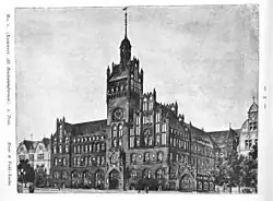 In 1897, the town council held a design contest for a new town hall.[3] Architect Hugo Licht, who designed the New Town Hall in Leipzig, led the selection committee. On 16 and 17 May 1898, the 87 contest entries were displayed to the public at the primary school on Deotymy Street. The committee selected Karl Zaar's design for a Gothic revival building.