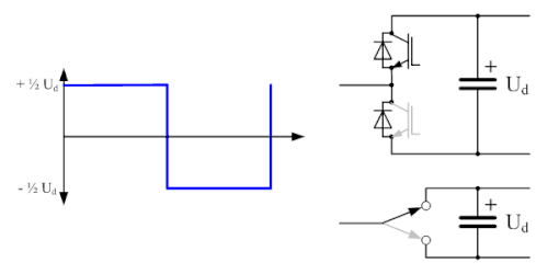 The MMC topology is similar to the three-level in that switching on various IGBTs will connect different capacitors to the circuit. As each IGBT "switch" has its own capacitor, voltage can be built up in discrete steps. Adding additional levels increases the number of steps, better approximating a sine wave. With enough levels, PWM is not necessary as the waveform created is close enough to a true voltage sine wave and generates very little harmonics.
