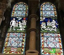 Burges conceived the iconographical scheme for the stained glass windows, designed the individual panels for each of the 74 windows, and oversaw every stage of their production. According to Maurice Carey, "in consequence, the windows have a consistent cohesive style and follow a logical sequence in subject matter".[54] The panels were cartooned by H. W. Lonsdale and manufactured in London between 1868 and 1869 by William Gualbert Saunders, who worked in Burges's office before forming his own firm of stained glass makers.[19][57] Doctrinal objections to some of the figures, particularly of Christ, lead to a four-year delay, with their eventual installation between 1873 and 1881. Four windows remain incomplete.[58] Lonsdale's cartoons are kept at the cathedral.[58]