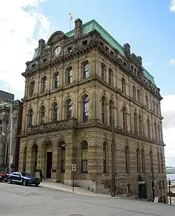 As Saint John rebuilt from the Great Fire in 1877, buildings would start to be constructed using brick and stone rather than wood.[30] During the late 19th to early 20th centuries, the most popular styles in the city were Queen Anne and Romanesque architecture. In 1911, a proposed city hall was to share Gothic and Second Empire architectural styles. Over time, the city would no longer adopt some of these styles.[31] Buildings in Saint John also feature stone carvings and sculptures.[32][33]