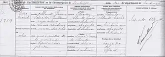 Allende was born on 26 June 1908[25] in Santiago.[26][27] He was the son of Salvador Allende Castro and Laura Gossens Uribe. Allende's family belonged to the Chilean upper middle class and had a long tradition of political involvement in progressive and liberal causes. His grandfather was a prominent physician and a social reformist who founded one of the first secular schools in Chile.[28] Salvador Allende was of Basque[29] and Belgian descent.[30][31][32] In 1909, he moved with his family to the city of Tacna (then under Chilean administration) until he returned to his country to live in Iquique in 1916. In 1918, he studied at the National Institute of Santiago, and from 1919 to 1921, he studied at the Liceo de Valdivia. In 1922, he entered the Eduardo de la Barra school at the age of 16, studying there until 1924.[33]