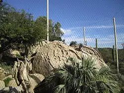 Opened in October 2004, Lion Camp houses the park's six African lions, Izu, Mina, Oshana and Etosha in a 1-acre (0.40 ha) exhibit.[28] The park's two other lions, Ernest and Miss Ellen, were moved to the San Diego Zoo. One side of the enclosure is dominated by an artificial rock kopje which has a 40-foot-long (12 m) glass viewing window and heated rocks.[28] The path continues along an acacia-studded ravine and leads to a replica observation tent. This has a smaller viewing window as well as a Land Rover for the lions to rest on.