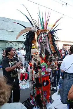 After the Spanish conquest of the Aztec Empire, the worship of Mictēcacihuātl (or Mictlancihuatl), the skeletal Aztec goddess of death, diminished but was never eradicated.[22] Judith Katia Perdigón Castañeda has found references dating to 18th-century Mexico. According to one account, recorded in the annals of the Spanish Inquisition, Chichimecs in central Mexico tied up a skeletal figure, whom they addressed as "Santa Muerte", and threatened it with lashings if it did not perform miracles or grant their wishes.[23] Another syncretism between pre-Columbian and Christian beliefs involving death can be seen in Day of the Dead commemorations. During these commemorations, many Mexicans flock to cemeteries to sing and pray for friends and family members who have died. Children partake in the festivities by eating chocolate or candy in the shape of skulls.[24] Perdigón Castañeda, Thompson, Kingsbury,[25] and Chesnut have countered the argument that Santa Muerte's origins are not Indigenous proposed by Malvido, Lomnitz, and Kristensen; stating that Santa Muerte's origins derive from authentic Indigenous beliefs. For Malvido this stems from Indigenist discourse originating in the 1930s. Nevertheless, ethnoarchaeological research by Kingsbury and Chesnut as well as archival work by Perdigón Castañeda, has established clear links between pre-Columbian death deity worship and Santa Muerte supplication.