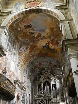 As mentioned, the ceilings of the side aisles, covered by cross vaults in succession, are also frescoed by Tommaso Sandrino, who arranged calibrated architectural spaces where the narrative panels, the work of Camillo Rama and Antonio Gandino, could be inserted.[80] In the right aisle are placed, starting from the counter-façade, Angels in Glory with censers, the Martyrdom at the Easel of the patron saints, and a group of Musician Angels. The left aisle, in the same sequence, is decorated by the Assumption of Mary probably by Ottavio Viviani, the Ascension of Jesus, and Saint Benedict in Glory.[81]