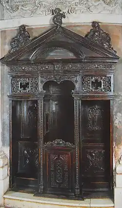 Confessionals: the church's four original confessionals, made in the early 17th century, are recessed in the side walls, two in each aisle, in the wall sections between the chapels. They are made of carved walnut wood, small in size and shallow in depth. Being placed under the four paintings already mentioned by the painters Barbello, Gandino and Terzi, they appear as a reference point for the latter in the guides of the time, starting with Bernardino Faino, who sees them in 1630.[129] The four artifacts appear mainly as architectural apparatuses, with the three compartments to house the confessors, lesenes, entablature, and triangular pediment, all complemented by various decorations and two finely carved gratings, placed above the side compartments to equalize the height with the central, higher compartment. Two allegorical figures are placed on the slopes of the pediment, while a small angel sits on the apex.[130]