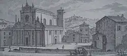 The church in a 1750 engraving by Francesco Battaglioli. The bell tower can be seen in its original form, the oratory of St. James lacking its neoclassical facade, the still uncovered Garza stream, and the old Discipline placed astride the latter, demolished in 1927. The view is to be considered enlarged: the clearing between the church and the Discipline, in front of the oratory, was actually narrower.