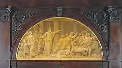 Giuseppe Teosa's lunette: the wooden compass of the side entrance, fabricated in 1831, is embellished with a painting by Giuseppe Teosa, a yellow monochrome lunette depicting the episode of Jesus driving the merchants out of the Temple. Teosa builds up each figure in detail, generating a dense series well characterized by neoclassical lines, even with types directly extracted from Roman art, as in the case of the sheep seller in the foreground on the far right. However, there is no shortage of sixteenth-century quotations, readable in the agitated postures of the fleeing merchants.[62][115]