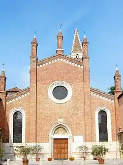 The simple terracotta facade is divided by pilasters into three vertical bands corresponding to the interior naves, the central of which is markedly higher than the two side naves.[31] Under the sloping roofs there is a decoration consisting of slightly projecting flying buttresses that are orthogonal to the slope of the roof, while above the eaves five small pillars decorated with a trefoil arch support tall pinnacles ending in a cross. Centrally there is a wide oculus, enclosed in a splayed marble frame with concentric rings, reminiscent of Lombard Gothic architecture.[11][32]