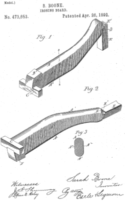 On April 26, 1892, Boone was granted United States patent number 473,563[1] for her improvements to the ironing board. Boone's ironing board was designed to improve the quality of ironing the sleeves and bodies of women's garments. The ironing board was very narrow, curved, and made of wood. The shape and structure allowed it to fit a sleeve and it was reversible, so one could iron both sides of the sleeve.[2][3]