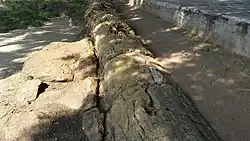 The petrified tree trunk is believed to be over 120 million years old, and is considered to be evidence for the presence of a sea during the Cretaceous period in this area. This fossil is of a conifer, measures around 18 meters long and a geological treasure.[1] Similar fossilized tree trunks have been found in nearby Varagur, Anaipadi, Alundalippur, and Saradamangalam,[5] all located within 10 kilometres (6.2 mi) of Sathanur.