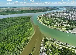The Sava discharges into the Danube, after reaching 68.3 metres (224 feet) a.s.l. as its right tributary at the Great War Island off the easternmost tip of Syrmia in Belgrade, 1,169.9 kilometres (726.9 miles) away from the Danube's confluence and the Black Sea.[58]