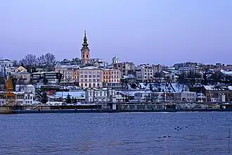 Population in the Sava River basin is estimated at 8,176,000, and includes four capitals: Belgrade, Ljubljana, Sarajevo and Zagreb. All except Sarajevo, are on the river banks and represent the three largest settlements found along the river.[59] Belgrade, at the lowest end of the river, is the largest city in the basin with urban population of 1,135,502. Ten municipalities of its outer conurbation have combined population of 1,283,783, taking in many mutual suburbs. The Belgrade metropolitan area has a population of 1,639,121.[60] Zagreb is the second largest city on the river, comprising population of 688,163 living in the city itself, and 802,588 in the city-administered area.[61] Together with the Zagreb County, largely corresponding to various definitions of the city's metropolitan area,[62] it has a combined population of 1,110,517.[61] Ljubljana is the third-largest city on the banks of the Sava, encompassing a population of 258,873 living in the city itself and 265,881 in the city-governed area.[63][64]