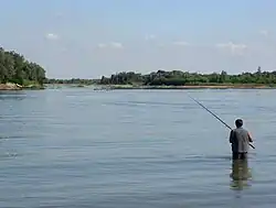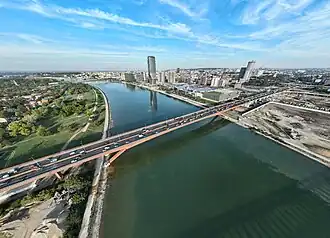 Downstream from the confluence of the Drina, the Sava River changes its eastward course to northeast, until it reaches Sremska Mitrovica, whence it flows southeast and then south to Šabac, before finally turning east towards Belgrade. Most of the river's course in Serbia represents a border between province of Vojvodina, on the left bank, and Central Serbia, on the right bank. Exceptions to that are in area around Sremska Mitrovica, where both banks are in Vojvodina, and downstream of Progar suburb of Belgrade where both banks are in Central Serbia. The river meanders and forms wetlands there as well—the most significant centering on Obedska bara oxbow lake.[13] The Sava River forms several large islands in this segment of the course, with the largest among them—800-hectare (2,000-acre) Ada Ciganlija in Belgrade—connected to the right bank by a pair of artificial embankment dams forming Lake Sava since 1967.[56][57]