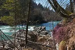 The Sava Bohinjka originates in Ribčev Laz, at the confluence of the Jezernica,[14] a short watercourse flowing out from Lake Bohinj and the Mostnica River.[15] Some sources define the Jezernica as a part of the Sava Bohinjka, specifying the latter as flowing directly out of the lake,[16] while another group of sources include the Savica, rising at the southern flank of Triglav as the 78-metre (256 ft) Savica Falls,[17] downstream from Triglav Lakes Valley, and flowing into the lake, as a part of the Sava Bohinjka.[18] The watercourse flows 41 kilometres (25 miles)—including the length of the Savica—east to Radovljica,[9] where it discharges into the Sava Dolinka. Downstream from the confluence, the river is referred to as the Sava.[12]