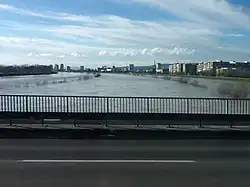 The westernmost part of the 562-kilometre (349 mi) Sava River course in Croatia,[40] takes the river east, through the western part of the Zagreb County, between Samobor and Zaprešić. The area encompasses forests interspersed by marshes and lakes formed in gravel pits.[41] As the Sava approaches the capital of Croatia, Zagreb, the marshes give way to urban landscape, but there are surviving examples of the gravel pit lakes, such as the Jarun,[42] and the Bundek within the city.[43] At the western outskirts of Zagreb, there is the western terminus of the 32-kilometre (20 mi) Sava–Odra flood-relief canal connecting the Sava to the Odra River plain which is intended to act as flood control retention basin.[44] The canal has been built in response to the most destructive flooding of the river that occurred in Zagreb in 1964, when one third of the city was flooded and 17 people were killed.[45] The city itself marks the western extent of the Sava River basin area especially prone to flooding, spanning from Zagreb to confluence of the river in Belgrade, Serbia.[46]