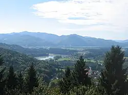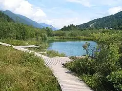 The Sava Dolinka rises at the Zelenci Pools near Kranjska Gora, Slovenia, in a valley separating the Julian Alps from the Karawanks mountain range.[10] The spring is near the Slovene-Italian border at 833 metres (2,733 feet) above sea level,[9][11] in a drainage divide between the Adriatic and Danube basins. The Sava Dolinka spring is fed by groundwater possibly exhibiting bifurcation of source karst aquifer to the Sava and Soča basins.[12] Nadiža creek, a short losing stream flowing nearby, is the source of Zelenci Pools water.[10] The Sava Dolinka is considered the Sava's initial,[9] 45-kilometre (28 mi) segment.[13]