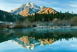 The Sava Dolinka is a headwater of the Sava River in northwestern Slovenia. The 45 kilometres (28 mi) long Sava Dolinka[1] starts as Nadiža Creek in the Planica Valley under Mount Zadnja Ponca in the Julian Alps, at an elevation of 1222 m, close to the Italian border. The stream goes underground soon after its source and breaks out again after 5 km at an elevation of 842 m in Zelenci, near Kranjska Gora. The Sava Dolinka flows through Kranjska Gora, Gozd Martuljek, Jesenice, between Bled and Breg, and past the town of Lesce. The first in a series of hydroelectric power plants on the river, the Moste Hydro Power Plant (22.5 MW), is located near Žirovnica. It merges with the second major headwater of the Sava, the Sava Bohinjka, at Radovljica. Tributaries of the Sava Dolinka include the Triglav Bistrica at Mojstrana and the Radovna, which flows through the Vintgar Gorge near Bled.