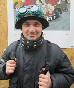 At the end of 2013, he was one of the organizers of the Euromaidan rallies in Korosten. He visited the Euromaidan in Kyiv several times, where he took part in the creation of the anarchist "Black Hundred".[13][14] On 1 December 2013, he took part in a mass rally in Kyiv, where, in a column of leftists, trade unionists and human rights activists, he protested against police violence. On 19 December 2013, the newspaper Ukrainian Truth published his article "Do you hear, Maidan?" (Ukrainian: Чуєш, Майдане?), where he called for the development of direct democracy and local self-government. In this article, he also proposed the principles of uniting Euromaidan and shared his thoughts on ways of public pressure on the authorities.[15]