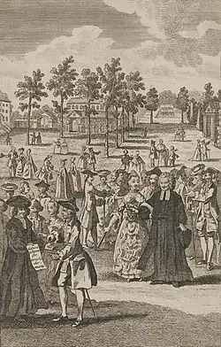 Sterne's sermons were popular and financially successful, reprinted even more frequently than his novels.[50] A poem by James Boswell describes the sermons as highly fashionable: "On Sterne's discourses we grew mad; / Sermons, where are they to be had? [...] A strange enthusiastic rage / for sacred text now seis'd the age. / Around St. James' every table / was partly gay and partly sable."[50] Another poem, published in The Anti-Times, highlighted the wide audience attracted to the sermons: "Rakes, bucks, bloods, and ev'n girls of night, / Conn'd Yorick's pages o'er with vast delight: / The courtiers, statesmen, beaus, and men of trade, / All read the sermons, which poor Y-rick made".[62] The first sermon collection in 1760 sold out and was followed by a second edition only two months later.[50] The second collection in 1766 was slightly less successful, as interest in Sterne's ongoing novel had waned.[30] The third collection, published posthumously, sold out and was re-issued within the year.[36] Each collection was published with an extensive list of names of supporters who funded its publication by subscription, including many of society's elite.[62]