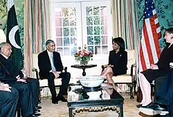 Aziz paid a farewell visit to South Korea to strengthen and enhance relations between the two countries.[61] Aziz cautiously supported South Korea's stance while refraining to criticise North Korea.[61] On a three-day state visit, Aziz and his counterpart Lee Hae Chan signed two agreements on cultural exchange and providing human resource management, and improving trade and cultural ties between South Korea and Pakistan.[61] Aziz strongly allied with the United States in the fight against terrorism, and in a meeting with an American journalist, Aziz maintained that: "Pakistan is now ideally positioned to "work with cooperation rather than confrontation as a force for peace, stability, and prosperity."[62] During his tenure, relations with the United States strengthened and progressed.[63] In 2006, Aziz quoted: "Pakistan-American relations are based on mutual trust and respect and are long-standing."[63] During his repeated visits to the United States, Aziz worked and deliberately approached the U.S. administration on building a strategic partnership with the United States, and made efforts to build a "robust-broad-based strategic relationship"..[64] Aziz's economic, domestic, and internal reforms focused on enriching a longer-term sustainable Pakistan-U.S. relationship and contributed immeasurably to both countries' joint struggle against extremism.[64]