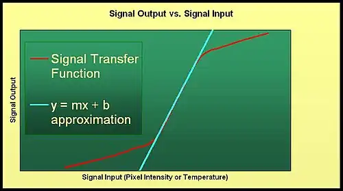 The net signal is calculated from the average signal and background, as in signal to noise ratio (imaging)#Calculations. The SiTF curve is then given by the signal output data, (net signal data), plotted against the signal input data (see graph of SiTF to the right). All the data points in the linear region of the SiTF curve can be used in the method of least squares to find a linear approximation. Given data points a best fit line parameterized as is given by:[3]