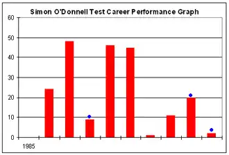 O'Donnell injured his hip at the beginning of the 1985–86 season and missed some early games.[41] He recovered in time to be selected for the first test against New Zealand.[42] He took a career best 2–53 and 5–66 against New South Wales.[43][44] However fellow all rounder Greg Matthews took 5–22 in the same game and he was preferred to O'Donnell, who was made 12th man.