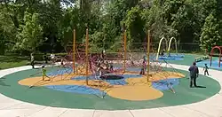 In July 2005, the Ann Newman Giant Wooden Slide was reopened,[7] and in August 2006 a new complex of swings called "Swing City" was opened.[8] By 2009, an area about three football fields in size had been redone, and the outside of the Playhouse preserved.[9] On July 31, 2019, a statue inspired by Ora Washington, titled "MVP", was added to the playground.[10] The Giant Slide is 40 feet (12 m) long, 12 feet (3.7 m) wide, 10 feet (3.0 m) high, and 12 children can use it at once.[4] The playground is for children 10 and under, accompanied by at least one adult 18 or older. There is a special play area for very young children.