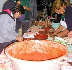 Sobrassada in Catalan, or sobrasada in Spanish, is a raw, cured sausage from the Balearic Islands (Spain) made with ground pork, paprika, salt and other spices. Sobrassada, along with botifarró, are traditional Balearic meat products prepared in the laborious but festive rites that still mark the autumn and winter pig slaughter known as a matança in Minorca, Majorca and Ibiza. The chemical principle that makes sobrassada is the dehydration of meat under certain weather conditions (high humidity and mild cold) which are typical of the late Balearic autumn.