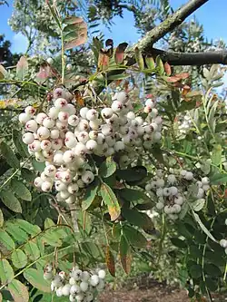 Sorbus forrestii, commonly known as Forrest's rowan, is a species of flowering plant in the family Rosaceae, native to western China. Growing to 8 m (26 ft) tall and broad, it is a spreading deciduous tree with leaves up to 20 cm (7.9 in) long, each divided into up to 19 leaflets (pinnate). White flowers in spring are followed by masses of white berries with pink tips in autumn.[2]