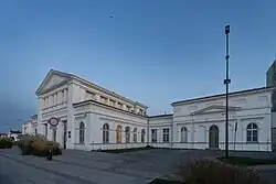 The station building from 1859 is located near Powstańców Styczniowych Square at 16 3 Maja Street in Sosnowiec. The two-story structure was likely designed by the Italian architect Henryk Marconi in the neoclassical style.[10] On September 30, 1999, the building was listed as a historic monument in the Silesian Voivodeship under the number A/15/99.[21] Until 2015, the station served as a library, and from May 2015 it was adapted for use as a tourist office. Eventually, the building became the headquarters of the Railway Line Plant in Sosnowiec - Polish State Railways Polish Railway Lines S.A.[22] Passenger service is conducted in the hall and under the station building. In the underground section of the station, there is a ticket office for Silesian Railways and a paid toilet.[23][24]