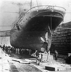 The rocky bottom is lined with 3 feet (0.91 m) of Portland cement overlaid by bricks and covered by Melbourne granite which is crossed by hardwood keel blocks. One Enoggera granite block was used in the coping to the west of the caisson (dock gate), next to a cast-iron plate bearing the contractor's name.[1]