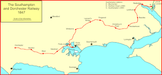 The Southampton and Dorchester Railway Act 1845 gave the LSWR running rights over the southern section of the Wilts, Somerset and Weymouth Railway. The line, which was taken over by the GWR in 1850, was laid with dual-gauge track between Dorchester and Weymouth to allow both companies' trains to operate.[45][46] The first trains ran over the new line on 20 January 1857, although trains to and from Weymouth could not call at the LSWR's Dorchester station without reversal.[43][47]