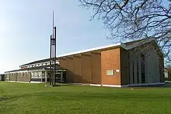 St Mary's Church is the Anglican parish church of Southgate. The churches in the Broadfield, Furnace Green and Tilgate neighbourhoods are linked to it as daughter churches.[63] Architects Henry Braddock and D.F. Martin-Smith designed it in 1958. The concrete and glass structure has a small flèche on top of a bell tower, and has an adjoining hall which can be opened out to increase the capacity of the church.[35] It is on Wakehurst Drive opposite the main shopping parade. The Church of Jesus Christ of Latter-day Saints has a meetinghouse on Horsham Road; it was designed by the chief architect of the town, Sir Thomas Bennett, and built in 1964 on land provided by Crawley Development Corporation.[64] ChristChurch (formerly Gateway Church International) on Brewer Road is a non-denominational church associated with the New Covenant Ministries International movement; its barnlike building has a semicircular roof.