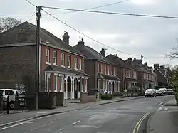 Crawley was connected to the railway network in 1848 when a line was built from Three Bridges to Horsham.[14] It crossed the High Street at a level crossing at the south end of the built-up area.[12] The provision of fast, regular trains to London and other destinations stimulated residential and commercial development, especially around the station.[14] South of the line, around the Brighton Road, there was plenty of land for building; in the second half of the 19th century, two building firms—the most important in Crawley's pre-New Town history—exploited it by building two areas of housing which still exist today, forming the northernmost part of the Southgate neighbourhood.[15][16] Richard Cook set up a building firm next to the railway line soon after its completion; in the early 1870s he built some streets of mainly terraced houses west of Brighton Road. Confusingly in the context of Crawley's later history, this area was called "New Town",[17] a name which persisted for many years; it had no connection with the later establishment of the New Town of Crawley under the New Towns Act 1946, the name being merely a coincidence. Based around Springfield Road and West Street, at the junction of which was Cook's yard, the "New Town" area had 43 houses in 1875.[12][18] In the early 1880s, James Longley established his building company nearby, which by 1909 had built an estate of houses east of the Brighton Road. The roads East Park and Malthouse Road had a mixture of terraced cottages, semi-detached houses, detached houses and large villas, all built from red brick.[12][19] Large houses were also built down both sides of the Brighton Road. Goffs Park Road, between the Brighton and Horsham Roads, began to be built up in 1895, and saw more residential development in the interwar period.[12]