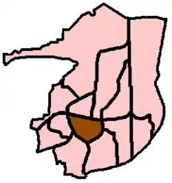 When Crawley Urban District was formed in May 1956,[42] it was divided into eight wards whose boundaries were identical with those of eight of the extant and planned neighbourhoods. By 1983, nine years after the district became a borough, the town had thirteen wards.[43] This position remained the same until an electoral review in 2002, which created two new wards. Throughout these changes, Southgate's ward boundaries remained the same, and they are still coterminous with those of the neighbourhood.[44] The ward elects three councillors.[44]