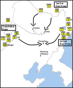 The 36th Army was also attacking from the west, but with the objective of meeting forces of the 2nd Far Eastern Front at Harbin and Qiqihar.[2]