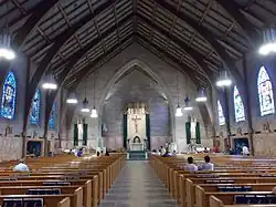The Cathedral of St. Francis was built in the Gothic Revival style and seats about 1,000 people.[1] The interior walls are composed of limestone with marble wainscotting. The floors are terrazzo and the woodwork is oak. The altars are carved from Italian marble. A bronze crucifix is above the altar as a part of the baldacchino. The facade features a rose window