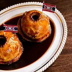 Like the main courses, the desserts are old-fashioned and served in large portions.[5][4] The signature desserts are a lattice-topped classic sugar pie and a rice pudding with salted caramel, which comes with small pastries called pets de sœurs ("nun's farts").[1][4] The bar serves exclusively French wines, a short list of classic cognac-based cocktails, and various beers and ciders including Labatt 50, regarded as a staple beer for the working class in Quebec.[1][8][22] A small selection of Japanese whisky is also available, a nod to the restaurant's location in historic Japantown.[22]