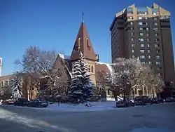 In 1883, a wooden frame building, measuring 50 by 24 feet, was opened and in 1894–1895, the present brick and fieldstone church was built. A chancel and transepts were added in 1905–06. It is the oldest church building in Regina still in use.[1] The organ console was, until May 1974, immediately north (both geographically and theologically) of the wall between the chancel and the chapel; the choir west of the altar; the organ pipes to the north of the chancel, behind the pulpit. The new organ pipes were in the north transept, above the choir, with the console at the southwest corner. The console and choir have been variously relocated since then.