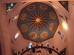 Around the dome there are various symbols, including the figure of Jesus Christ; the Holy Spirit represented by a dove; the Greek letters alpha and omega superimposed on the scriptures; wheat and grapes representing the Eucharist; and the Phoenix symbolizing resurrection etc.[1] A series of high, narrow, stained-glass windows are set into the main walls of the cathedral below the dome depicting scenes in the life of Christ and early Christianity in Armenia. The patron saint of the cathedral, St. Vartan, is depicted fighting the Sassanid Persians who threatened the Armenian Church during the fifth century. Ecumenism is symbolized in the portrait of St. Nerses and the crosses of Christendom.[1]