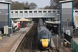 The main building is on the south side of the line, nearest the town centre and facing the bus station. It was built in 2001 to a design by Lacie Hickie Caley[16] and contains a booking office and shop. The wooden building on this platform dates from Great Western Railway days. The station car park is situated behind this platform. An accessible footbridge links the two platforms.