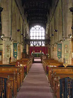 The font dates from about 1493. It is boldly carved and includes heraldry relating to the lordship of Bromfield. In the aisle to the south of the chancel is a Decorated piscina which has been moved from elsewhere. A memorial plate in the north chancel aisle is dated 1666.[5] The two-manual organ is a 1910 Norman and Beard organ moved from a redundant church in the North of England which was rebuilt and installed in 1976.[6] There is a ring of six bells which were all cast in the 18th century by Rudhall of Gloucester.[7] There are obvious signs of Civil War combat within the church: the west wall is pitted with holes made by musket balls, and the north door is pierced by three plugged loopholes, made for firing musket rifles.[8][9] The Crue memorial is a brass tablet commemorating Thomas Crue (d. 1666) with an acrostic on the deceased's name.[9]