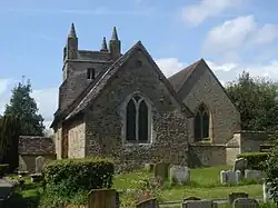 The church was built on hilly ground overlooking Bolney from the south, and was reached by a twitten (a narrow lane) from the village street.[7][8] The core of the Norman building consisted of a nave, a narrower chancel set at an angle,[5] one window in the east wall and the doorway in the south wall of the nave.[1] To this was added the main east window in the end of the chancel—a large traceried window dating from about 1300.[10] The south wall of the chancel has a window of a similar date,[5] and on the same wall is a 13th-century piscina.[1]