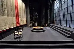 In relationship to approaches to scenography, cultural scenographer Rachel Hann has proposed that there "are no stages without scenographics".[3] This is based on an argument that "all stages are also scenes",[4] which challenges the "deterministic assumption that stages precede scenography".[5] In this model, stages become manifest through the place orientating traits of scenographics (rather than the other way around). The implications of this are that all theatre is scenographic – even if it has no defined objects or 'setting' – as all theatre is performed on a stage. Hann summarises this position by using the hybrid 'stage-scene' when discussing the tensions between the histories of these practices, particularly with reference to original Greek skene as a physical tent or hut that ultimately shaped current conceptualizations of 'the stage'.