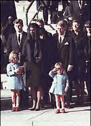 A group descends the steps of the United States Capitol. Robert F. Kennedy and Patricia Kennedy Lawford, in the back, follow former First Lady Jacqueline Kennedy, dressed in black, accompanied by her children John F. Kennedy Jr. and Caroline Kennedy.