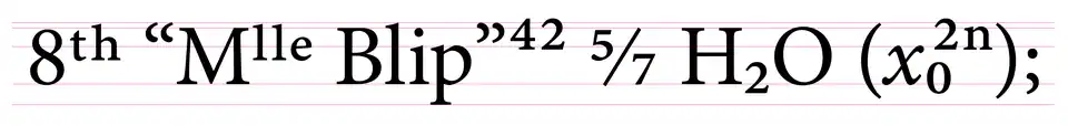 This image shows the four common locations for subscripts and superscripts, according to their typical uses. The typeface is Minion Pro, set in Adobe Illustrator. Note that the default superscripting algorithms of most word processors would set the "th" and "lle" too high, and the weight of all the subscript and superscript glyphs would be too light.