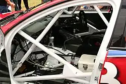 Many safety features are utilised to protect the driver in the event of a crash. The fuel tank is positioned in front of the rear axle to prevent it from being damaged or ruptured in a rear end impact. The driver is seated towards the centre of the car and extra reinforcement is used on the roll cage on the driver's side to lessen the risk of injury in a side-on collision. The cars also feature a collapsible steering column and a fire extinguisher system.[11]